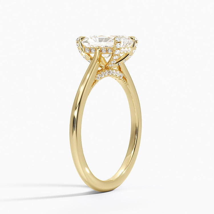 Nature-inspired elegance shines in this lab-grown Radiant-cut diamond engagement ring, featuring a delicate vine halo design. The graceful curves and floral motif embrace the center stone, offering a romantic and ethically crafted ring that celebrates love in full bloom.
