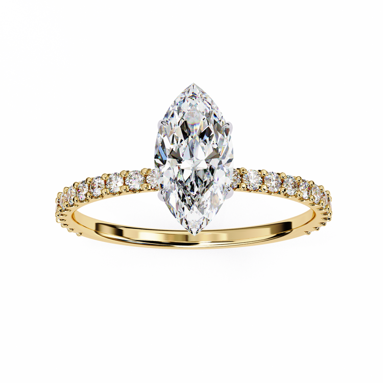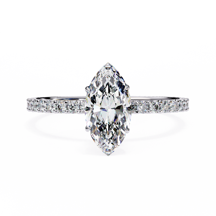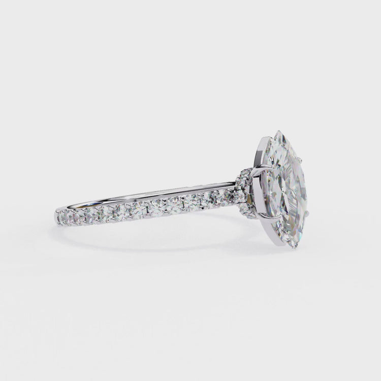 Nature-inspired elegance shines in this lab-grown Marquise-cut diamond engagement ring, featuring a delicate vine halo design. The graceful curves and floral motif embrace the center stone, offering a romantic and ethically crafted ring that celebrates love in full bloom.